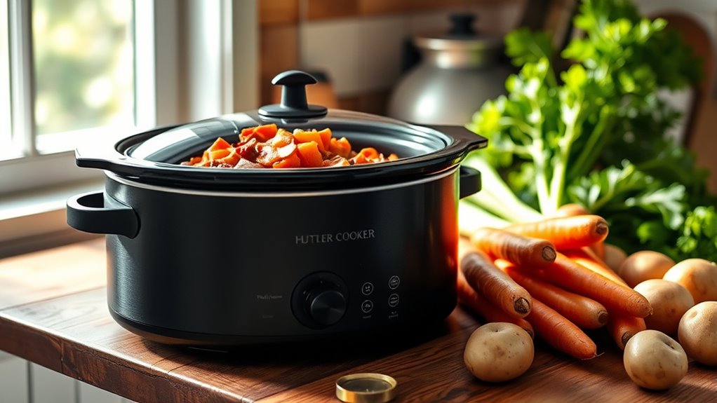 Choosing a slow cooker with versatile programming options makes busy family dinners much simpler. Look for models with adjustable timers, preset modes, and precise temperature controls to handle a variety of recipes effortlessly. Digital controls and displays help you monitor settings and cooking times easily, reducing guesswork. A delay start feature is invaluable, allowing you to set your cooker ahead of time so dinner is ready when you arrive home. The Keep Warm function ensures your meal stays at the perfect serving temperature without overcooking. Additionally, customizable settings that let you adjust cooking duration and temperature make it easier to tailor meals to your family’s preferences. Overall, flexible programming simplifies meal prep and helps you serve delicious, perfectly cooked dishes every time.