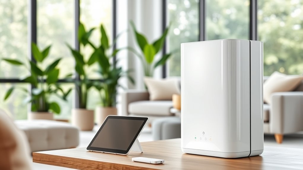 When selecting a smart air purifier, considering noise and sleep features is crucial to guarantee your comfort overnight. Noise levels can range from as low as 20dB in sleep mode to over 50dB at higher settings, which can disturb your rest. Many models include a dedicated sleep mode that dims lights and reduces fan speed, ensuring quieter operation. The best sleep-friendly purifiers operate below 30dB—similar to a whisper—so they won’t disrupt your sleep. Some units automatically adjust fan speed based on real-time air quality, maintaining quietness when air is clean. Additionally, adjustable sleep or quiet modes let you personalize noise levels, balancing comfort and purification effectiveness. Prioritizing these features helps ensure peaceful, restful nights while keeping your air fresh.