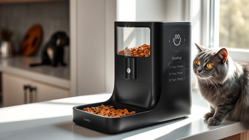 Ensuring your pet receives the right amount of food hinges on the precision of portion control features in your smart pet feeder. Accurate portioning prevents overfeeding or underfeeding, supporting your pet’s health and dietary needs. Look for feeders with adjustable portion sizes measured in grams, teaspoons, or cups, so you can tailor servings precisely. Digital or electronic models generally offer more accurate control than mechanical or manual options. Some feeders even include built-in scales or sensors that measure the exact weight or volume of dispensed food, ensuring consistency with every meal. This level of precision helps maintain a healthy weight and aligns with specific dietary plans. Ultimately, a smart feeder with reliable portion control makes mealtime easier and more effective for your pet.
