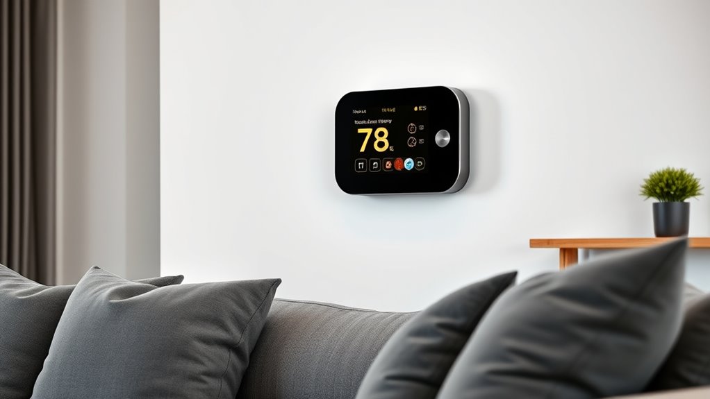 Considering the cost of a smart thermostat involves more than just the initial purchase price; it’s essential to factor in installation, accessories, and any subscription fees for premium features. I look at the energy savings potential, especially since ENERGY STAR models can cut utility bills by around 23-26%, boosting long-term value. Comparing the upfront cost with these savings helps me determine overall cost-effectiveness. I also focus on features that match my needs, avoiding unnecessary extras that inflate the price. Additionally, I check for rebates or discounts, which can markedly lower the final expense. By evaluating both initial investment and potential savings, I ensure I choose a smart thermostat that offers the best balance of affordability and efficiency.