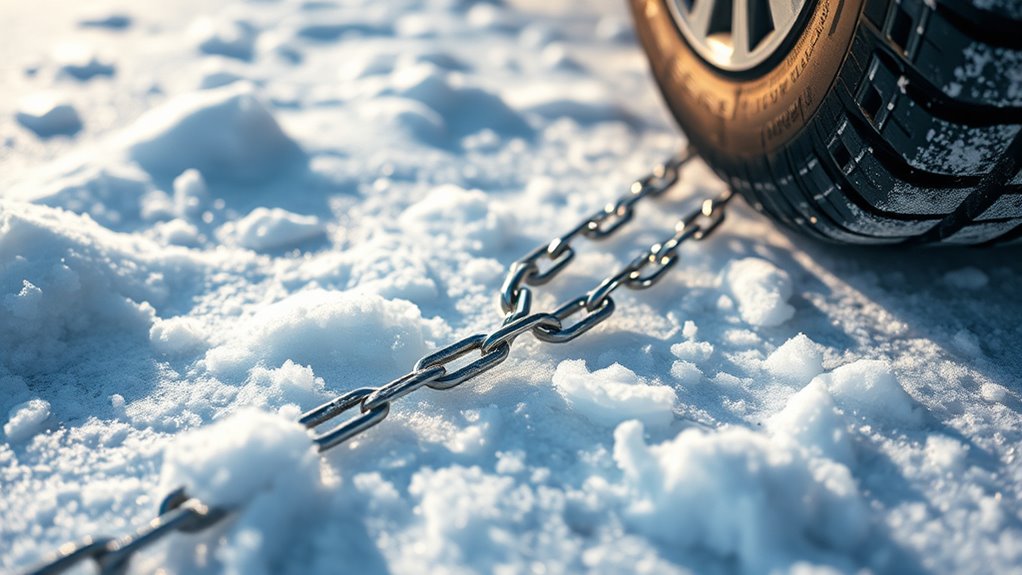 Ever wondered what makes snow chains grip ice and snow effectively? It all comes down to their traction performance, which depends on the pattern and materials. A diamond pattern offers smoother rides while providing superior grip, especially on icy surfaces. Chains made from alloy or manganese steel alloys tend to deliver better durability and traction in winter conditions. It’s essential that the chains fit your tire size properly to guarantee maximum contact and ideal grip. Proper installation and tensioning are critical to prevent slipping or fly-off during use. Additionally, reinforced cross members and specialized traction coils can considerably improve your vehicle’s starting, stopping, and cornering capabilities on snow and ice. Choosing the right combination ensures safety and confidence on treacherous winter roads.
