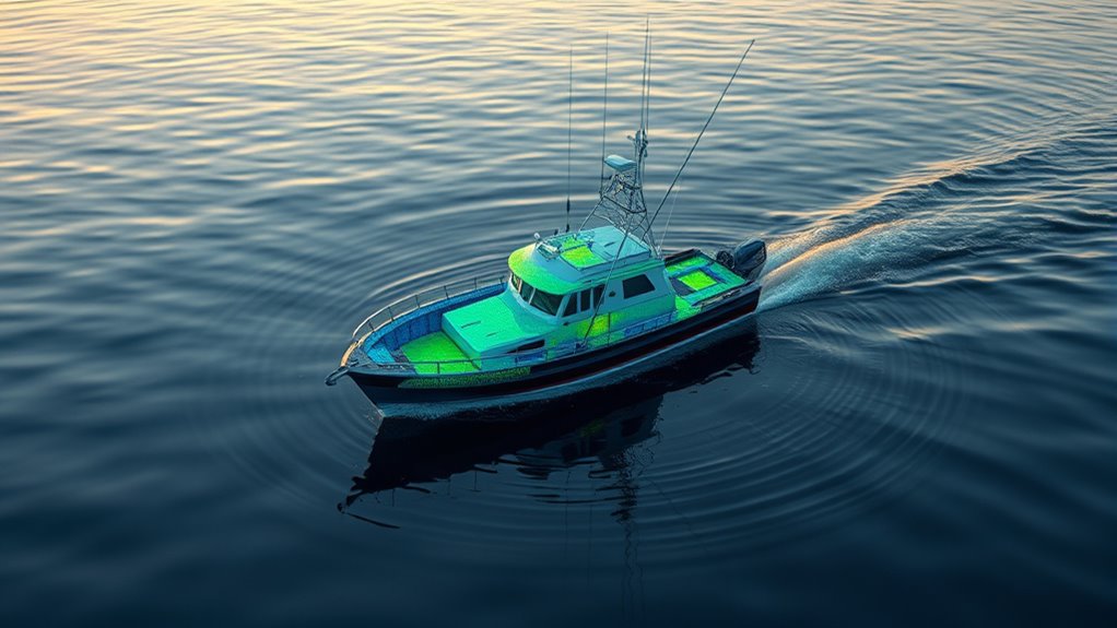 Weather is like the mood of the sea, and just as moods shift, so does sonar performance. Storms, heavy rain, or fog create a foggy mental state for sonar, scattering signals and diminishing clarity. Calm, clear conditions act like a mirror, reflecting precise data back. I’ve learned to read these weather signals, adjusting my approach to guarantee I get the most accurate depth maps, no matter what the sky’s doing.