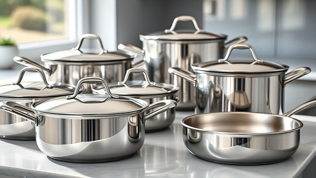 Choosing the right stainless steel cookware set depends heavily on your budget, as prices can vary considerably from budget-friendly options around $50 to premium sets over $500. When considering your budget, focus on the number of pieces included, since more extensive sets cost more but offer better value for diverse cooking needs. Keep in mind that lower-cost sets often have thinner construction or fewer features, which can impact durability and performance over time. A mid-range set strikes a good balance, providing durable materials and essential features without breaking the bank. Always compare prices across multiple retailers and check for warranties or guarantees. Doing this helps ensure you get the best value within your budget, making your investment worthwhile.