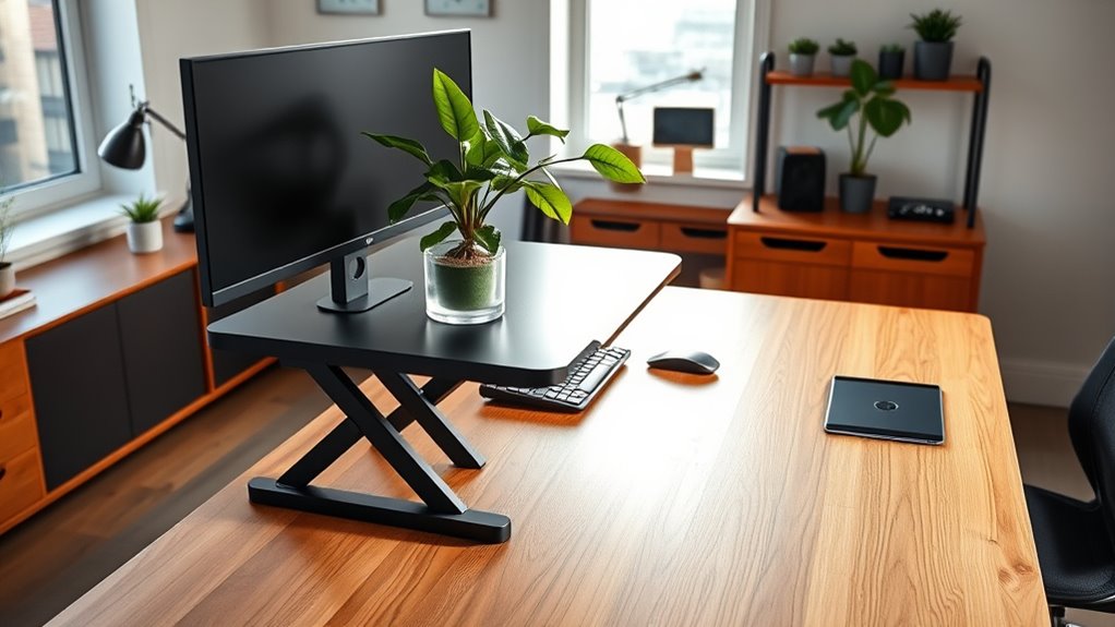 An ergonomic standing desk converter should have adjustable height settings so it can suit users of different heights and preferences. This flexibility ensures you can find the perfect ergonomic position, reducing strain and fatigue. Stability is crucial, so look for a converter with a sturdy construction that supports monitors, laptops, and accessories without wobbling. The design should promote proper posture by positioning monitors at eye level and keyboards at a comfortable typing height. Smooth, effortless height adjustment mechanisms, like pneumatic or gas spring lifts, make shifting between sitting and standing easier and less tiring. Rounded edges and a sleek surface not only enhance comfort but also prevent wrist or arm discomfort during extended use. Prioritizing ergonomic design helps create a healthier, more comfortable workspace.