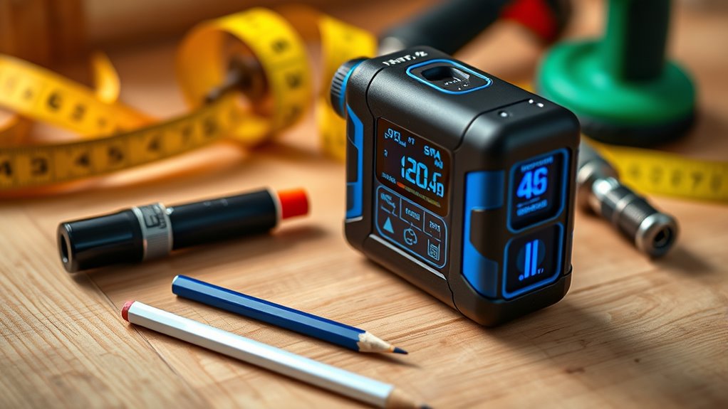 Choosing the right sensor technology is essential for guaranteeing your stud finder delivers accurate and reliable results. Electronic sensors like capacitance detect changes in wall density, while magnetic sensors find metal fasteners. Multi-sensor models combine these technologies to improve detection accuracy and reduce false positives caused by wall irregularities. The number of sensors, such as 9 or 13, directly impacts precision and the ability to locate studs accurately. Deep scanning sensors can detect objects up to 1.5–1.7 inches beneath the surface, ideal for thicker walls. Advanced sensor chips equipped with microprocessors boost sensitivity and reliability, offering real-time visual indicators that minimize errors. Selecting a device with the appropriate sensor technology ensures you get precise readings and confidence in your wall scans.