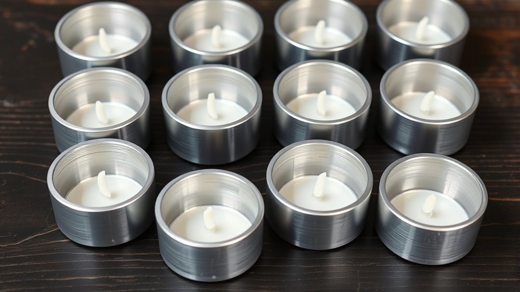 Choosing the right aluminum mold for tea-light candles hinges on its durability, which directly affects how well it withstands the intense heat of candle making. A durable aluminum mold can resist warping or cracking during high-temperature use, guaranteeing consistent shapes and safety. The thickness of the aluminum plays a vital role; thicker molds tend to last longer and resist deformation over multiple uses. Corrosion-resistant aluminum is essential, as it maintains structural integrity and appearance over time, even when exposed to wax and heat. Additionally, quality molds with smooth surfaces make demolding easier and minimize damage to finished candles. Properly constructed aluminum molds not only improve efficiency but also guarantee that your candles come out perfectly shaped, making durability a critical factor in selecting the ideal mold.