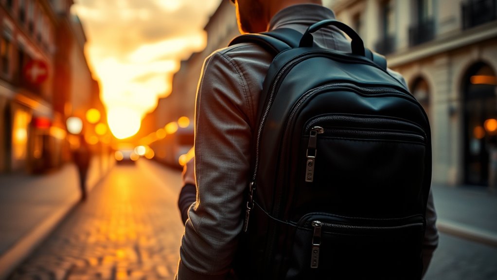 Anti-theft backpacks prevent pickpocketing by incorporating hidden zippers, lockable compartments, and cut-resistant materials that deter thieves. I always look for backpacks with lockable zippers and RFID-blocking pockets to keep my valuables secure. Their secure design makes it difficult for pickpockets to access my belongings unnoticed. By choosing these features, I feel confident traveling because my essentials stay safe, no matter how crowded or risky the environment.