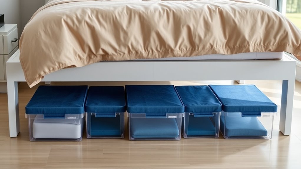 I recommend opting for durable plastic or heavy-duty fabric bins with sturdy frames. Brands like Rubbermaid and Sterilite are known for their long-lasting, impact-resistant plastic containers. Look for bins with reinforced handles and thick walls to withstand frequent use and weight over time. I’ve found these materials and features guarantee your under-bed storage stays intact and reliable, even after years of regular access.