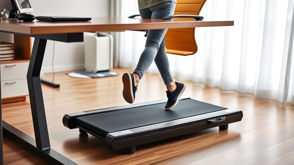 As I explored these under-desk walkers, it struck me how the best choices often align with our needs—like finding a hidden gem when we least expect it. The high motor duty cycles reveal a surprising depth of durability, almost as if these devices were built with our busy, low-impact routines in mind. Ultimately, selecting the right one feels like a fortunate coincidence, turning a simple workout into a seamless part of my day.