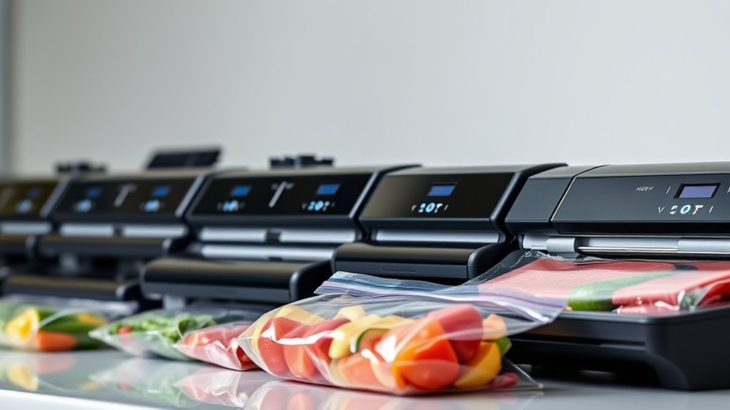 Ever wondered what makes some vacuum sealers keep food fresh for longer periods? It all comes down to sealing strength and vacuum quality. High-powered models with suction levels of 80-90kPa create a tighter seal, notably extending freshness. Adjustable sealing modes also play a vital role, allowing you to optimize preservation for different foods, whether delicate or dense. Speed and consistency matter too; faster, reliable sealing ensures minimal exposure to air, preserving quality longer. Additionally, pairing your vacuum sealer with high-quality, airtight bags can dramatically increase storage duration. By considering these factors—power, modes, speed, and bag quality—you can choose a vacuum sealer that maximizes your food’s shelf life and keeps it fresher, longer.