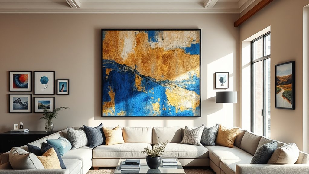 Have you considered how the material and texture of wall art can transform the vibe of your living room? The choice of materials—canvas, wood, metal, or fabric—affects not just durability but also the visual and tactile appeal. Textured pieces like 3D reliefs or woven tapestries add depth and invite touch, making your space more dynamic. The way light interacts with different materials creates shadows and highlights, shaping the overall ambiance. Eco-friendly options, such as reclaimed wood or organic cotton, add sustainability and unique textures that stand out. Additionally, surface finishes—whether smooth, matte, glossy, or textured—can perfectly complement your interior style, influencing the room’s mood. Selecting the right material and texture ensures your wall art enhances your living room’s personality and atmosphere.