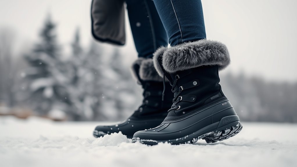 Beyond durability and material, style options play a key role in selecting the perfect waterproof snow boots. I find that ankle, mid-calf, and knee-high styles offer versatility for various outfits and activities, from casual errands to winter hikes. A range of finishes—matte, glossy, or textured—lets me customize the look to match my personal style. Decorative details like faux fur trims, buckles, or lace-up fronts add extra flair, making the boots both functional and fashionable. Neutral colors like black, gray, and brown easily coordinate with my winter wardrobe, while bold hues make a statement. Some styles even feature foldable shafts or removable accessories, allowing me to switch up my look effortlessly. Versatile style options guarantee I stay warm, dry, and stylish all season long.