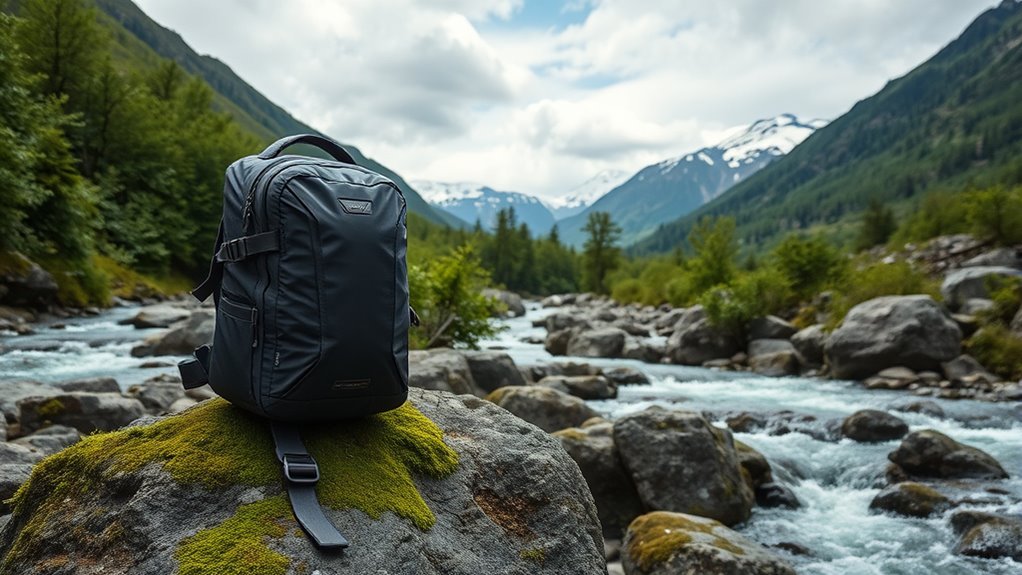 A key aspect of a weather-sealed camera backpack’s effectiveness is its storage flexibility, which allows you to adapt to different gear setups on the go. Look for adjustable dividers that can be customized to fit various camera bodies, lenses, and accessories, ensuring a snug fit and easy access. Modular compartments are also essential, letting you reconfigure the interior to suit your specific equipment needs. Expandable features like roll-top closures or extra pockets provide additional space when needed, perfect for carrying extra gear or personal items. Internal organization with multiple pockets and slots helps keep batteries, memory cards, and small accessories neatly separated and accessible. Versatile access points, such as side zippers or full-length back openings, enable quick retrieval of gear without disturbing the rest of your setup.