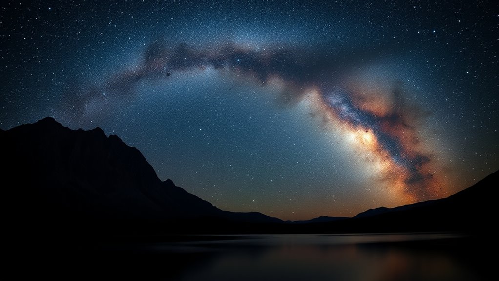 Choosing a wide-field lens with a large aperture is essential for capturing stunning images of the Milky Way, especially in low-light conditions. A bigger aperture, like f/1.2 or f/2.8, lets in more light, which is fundamental for revealing faint stars and details in the night sky. It also allows for shorter exposure times, reducing star trails caused by Earth’s rotation. Additionally, wide apertures improve overall image quality by minimizing noise and enhancing color accuracy and detail. Lenses with smaller f-numbers—such as f/1.4 or f/2.0—are particularly effective because they achieve the necessary brightness without requiring excessively high ISO settings. Ultimately, the aperture size plays a key role in determining the brightness, clarity, and overall quality of your Milky Way photos.