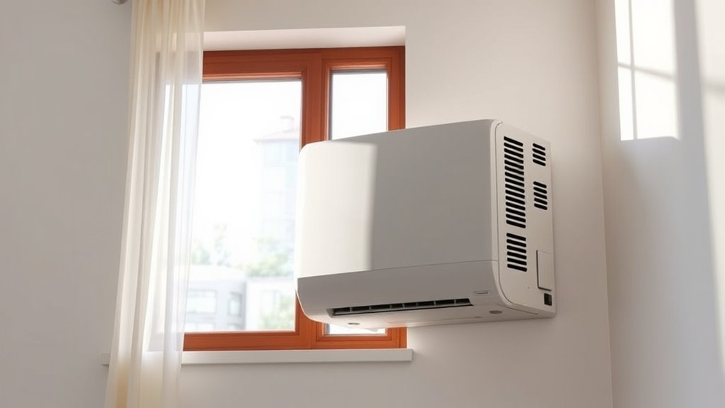 Choosing the right window for your AC unit is crucial for quiet, efficient operation, so it’s important to guarantee the opening meets the unit’s size requirements. Typically, this means ensuring the window is between 22-36 inches wide and at least 13-14 inches high for a secure fit. Position the unit away from direct sunlight, heat sources, or noisy areas to maximize cooling efficiency and reduce sound amplification. Make sure airflow isn’t obstructed by walls, furniture, or curtains, which helps promote even cooling. Use side panels or insulation to seal gaps around the unit, minimizing noise infiltration and preventing cool air from escaping. In the end, secure the unit with a level mounting system to reduce vibrations and noise during operation.