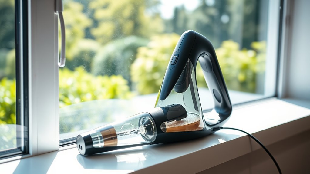 Since ease of operation can make or break your cleaning experience, it’s essential to select a window vacuum that’s simple to utilize. Look for models with one-button controls, so you don’t waste time figuring out complicated settings. An ergonomic handle is a must, reducing hand fatigue during longer cleaning sessions. Clear instructions or indicator lights help guide proper use, making the process more intuitive. Quick setup and minimal assembly save you time and frustration. Additionally, choose a lightweight vacuum, ideally under 2 pounds, so maneuvering and handling are effortless. These features ensure your cleaning routine is smooth and stress-free, allowing you to clean windows efficiently without unnecessary hassle. Prioritizing ease of operation helps you achieve sparkling results with minimal effort.