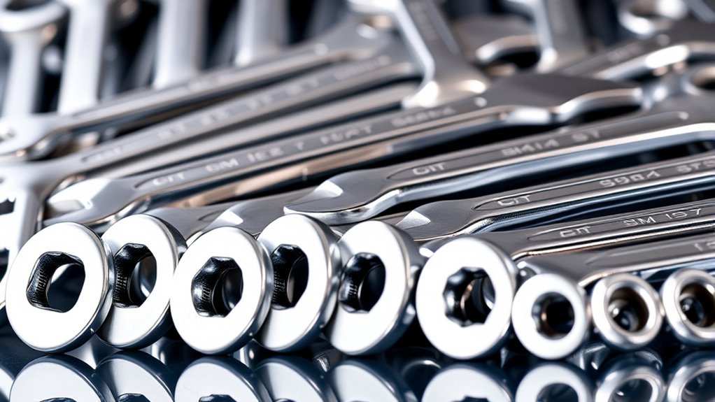 Choosing the right wrench set involves more than just size and shape; finish and corrosion resistance play a vital role in ensuring longevity and reliable performance. A high-quality finish like chrome or mirror chrome enhances resistance to rust and corrosion, helping your tools last longer. Wrenches with a smooth, polished surface are less likely to trap moisture or dirt, reducing corrosion buildup. Protective coatings, such as chrome plating, create a durable barrier against oxidation, especially in humid or salty environments. These finishes also make cleaning easier and maintenance simpler, ensuring consistent performance over time. Investing in wrenches with proven corrosion-resistant finishes helps prevent fastener rounding and maintains tool integrity during heavy-duty tasks. Ultimately, a good finish extends your tools’ lifespan and keeps them performing at their best.
