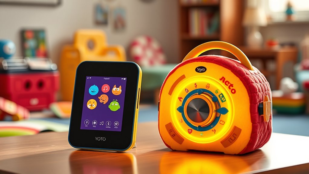 In 2025, I find that choosing between Yoto Player and Toniebox depends on your child’s needs and your preferences. Yoto offers a vast digital library, a colorful display, and customization options, perfect for older or tech-savvy kids. Toniebox shines with its simple, tactile design, sturdy build, and character-based content, ideal for very young children. If you’re curious about which device brings the most safety, fun, and value, keep going—you’ll discover more here.