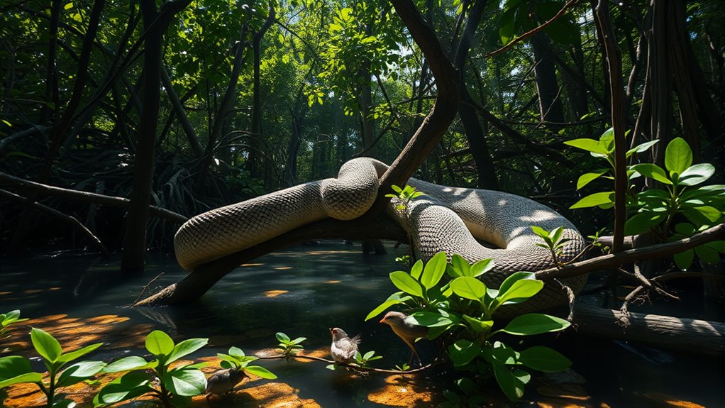 You might be surprised, but Burmese pythons survive Florida’s climate by adapting to its warm, humid environment. They thrive in wetlands, near water bodies, and in dense vegetation, which provides cover and hunting grounds. Their semi-aquatic nature helps them stay cool and hunt effectively. Additionally, Florida’s mild winters allow them to remain active year-round, giving them a significant advantage in establishing and expanding their populations in the region.