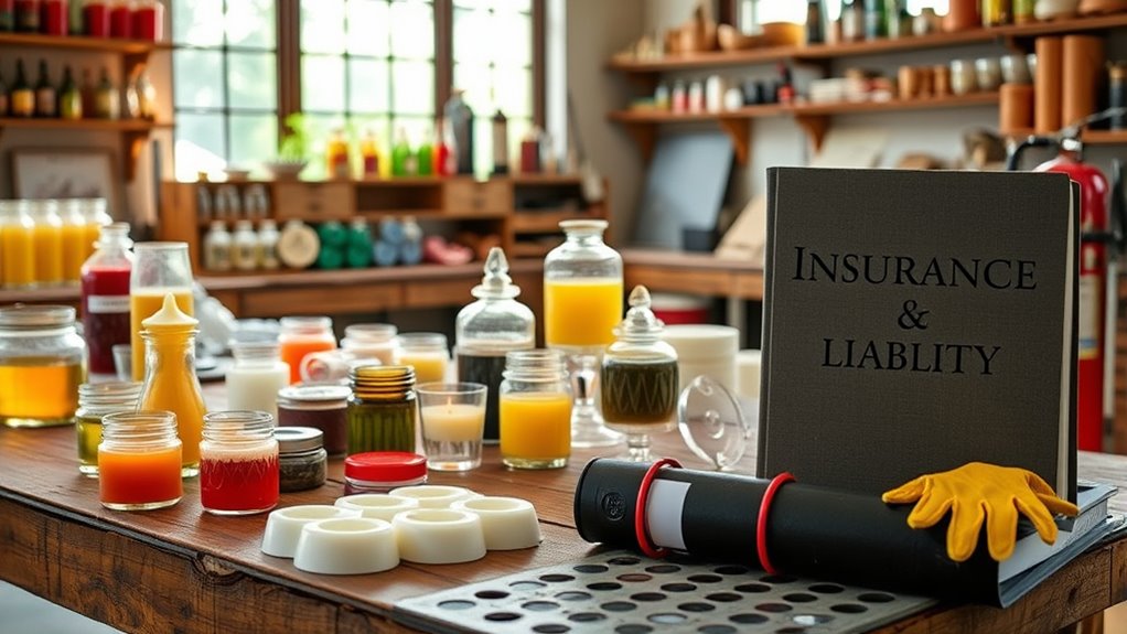 To protect your candle business, you need the right insurance coverage, including general liability, product liability, and property damage insurance. These policies help cover legal claims, accidents, fires, or theft. Ensuring safety standards and proper handling of materials reduce risks and liabilities. Managing employee safety and staying compliant with regulations are also crucial. Keep in mind that choosing suitable coverage is essential, and more tips to safeguard your business are just ahead.
