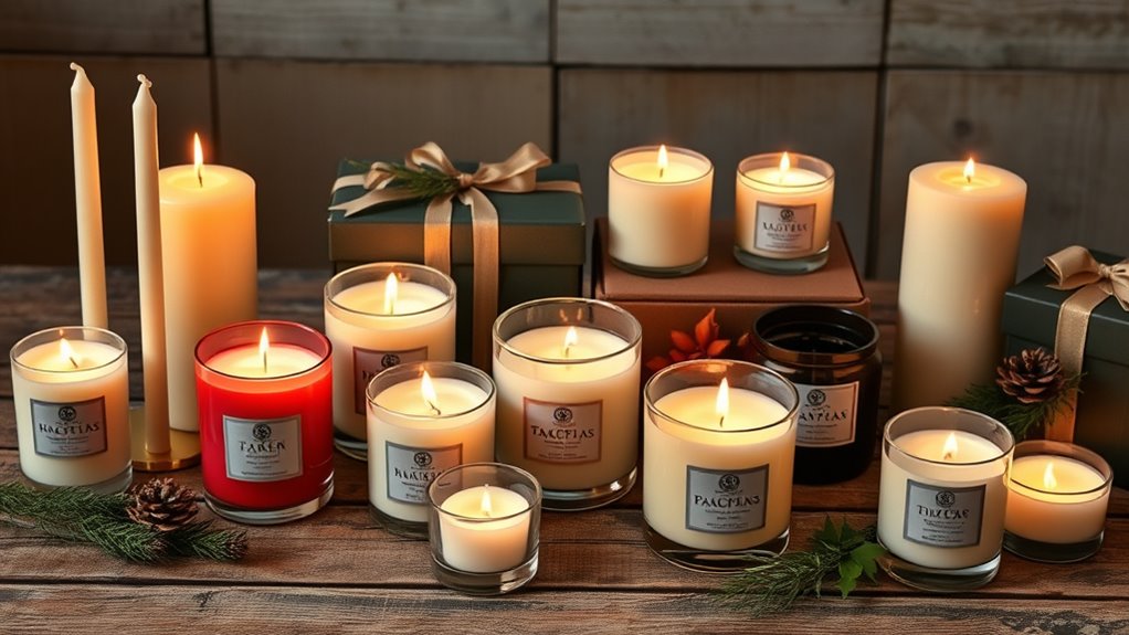 You’ll love the latest candle style trends for gifts, especially if you focus on scent layering to create personalized aromas. Opt for candles with sleek, minimalist candle packaging that looks elegant and modern. Trendy gift sets often combine different sizes and scents, encouraging scent layering for a unique experience. These stylish candles make thoughtful presents, blending visual appeal with customizable fragrances, perfect for impressing anyone on your gift list.