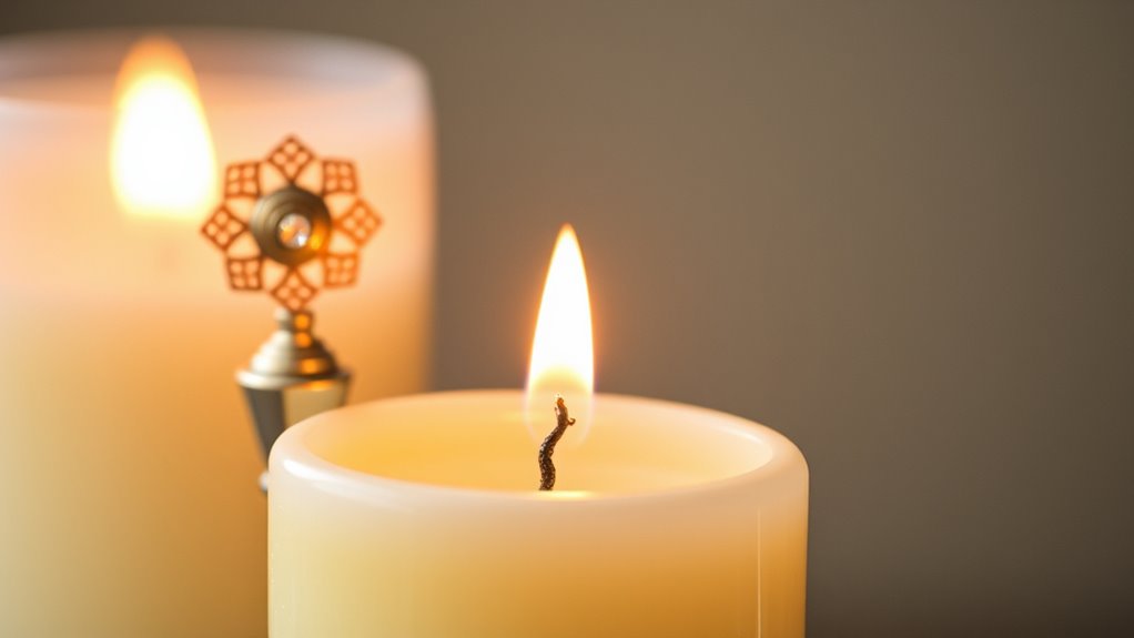 Always verify your custom toppers are heat-resistant and don’t interfere with proper burning. Creative personalization can make your candles more meaningful and visually striking, just keep safety and candle fragrance in mind for a beautiful, safe glow.