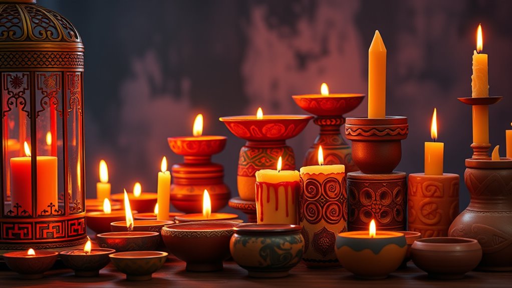 Have you ever wondered why candles play such an essential role during Diwali in India? During this Hindu festival, candles symbolize the victory of light over darkness and good over evil. You’ll notice that homes are decorated with countless diyas and candles, creating a luminous atmosphere. This tradition aligns with Hindu festival rituals that honor Lord Rama’s return to Ayodhya, where lighting lamps marked the triumph of righteousness. Candles also complement Diwali fireworks, which light up the night sky, but the smaller, steady glow of candles brings a more personal, spiritual touch. By illuminating homes and streets, candles help you focus on inner reflection and communal celebration, reinforcing the festival’s core message of hope, renewal, and spiritual awakening. Incorporating traditional lighting elements enhances the cultural significance and ambiance of the celebration. Additionally, the use of candles emphasizes contrast ratio in creating a warm and inviting environment that elevates the spiritual experience. The gentle flicker of candlelight can also symbolize inner peace, fostering a sense of calm and mindfulness during the festivities.