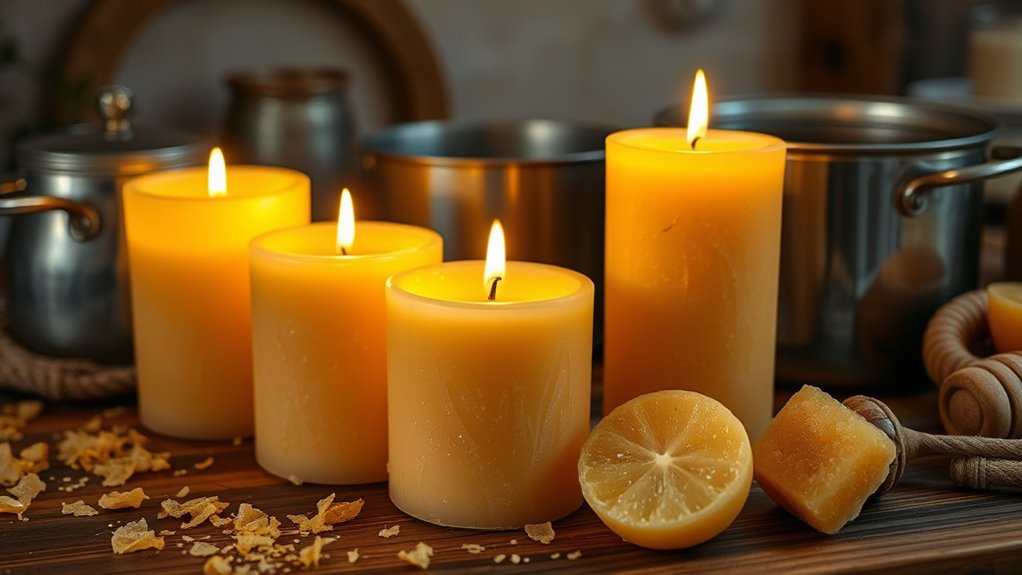 To prepare the beeswax for candle making, start by cutting or breaking it into small, manageable pieces. This helps guarantee even melting and maintains beeswax purity. Next, consider the purity level, as high-quality beeswax produces cleaner, longer-lasting candles. Before melting, you might want to gently pre-warm the wax to remove any residual impurities. If you’re planning to scent your candles, choose beeswax that is either unscented or lightly scented, as strong scents can interfere with your candle scenting process. Additionally, dyeing beeswax can add color to your candles if desired. For optimal results, using quality beeswax ensures the best appearance and burning qualities. Also, understanding the cost-effective production of beeswax can help in managing expenses for larger projects. Finally, keep your workspace clean and organized to prevent contaminants. Proper preparation ensures your beeswax melts uniformly and results in beautiful, pure candles with the desired scent profile.