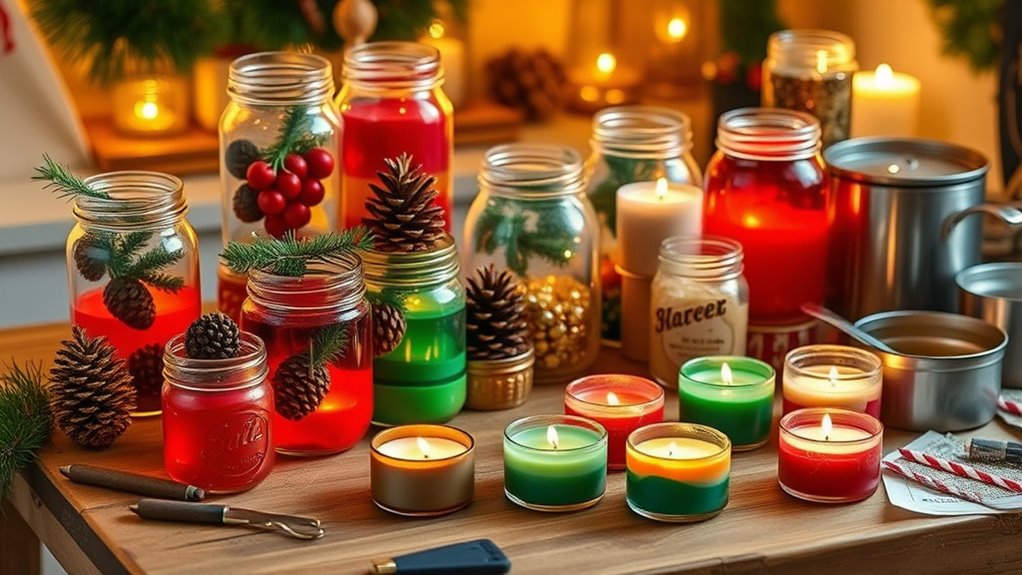 Get ready to craft beautiful holiday candles using materials like burlap, twine, and natural embellishments such as pinecones and dried berries. You can create cozy scented pinecone candles, festive mason jar designs, or glittering snowflake tealights for a sparkling touch. Remember to follow safety tips like trimming wicks and burning on heat-resistant surfaces. Keep exploring for detailed steps and more ideas to make your holiday decor truly special.