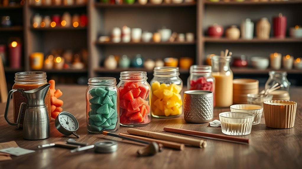 Selecting the right supplies and equipment is essential to guarantee your candle-making process runs smoothly and produces high-quality products. First, choose the appropriate wick based on your candle size and wax type, as wick selection affects burn quality and fragrance throw. Second, stock a variety of fragrance options to appeal to different tastes and create distinct scents for your candles. Third, invest in quality equipment like a double boiler or melting pot for safe, even wax heating, and precise pouring tools. Properly selecting these supplies assures consistent results and customer satisfaction. Remember, the right wick and fragrances are key to a successful candle line, so prioritize quality and compatibility when building your supply list.