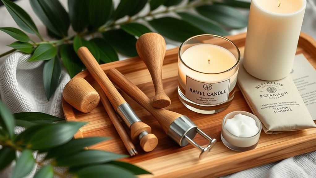 To reduce waste and embrace eco-friendly living, choose reusable candle wicks and holders made from durable materials like glass or ceramic. Opt for natural waxes such as beeswax, soy, or coconut wax, which burn cleaner and support sustainability. Use biodegradable packaging and eco-conscious containers to minimize environmental impact. Maintain your accessories with natural cleaners like vinegar and baking soda. Discover more ways to create a low-waste candle setup that’s beautiful and sustainable.