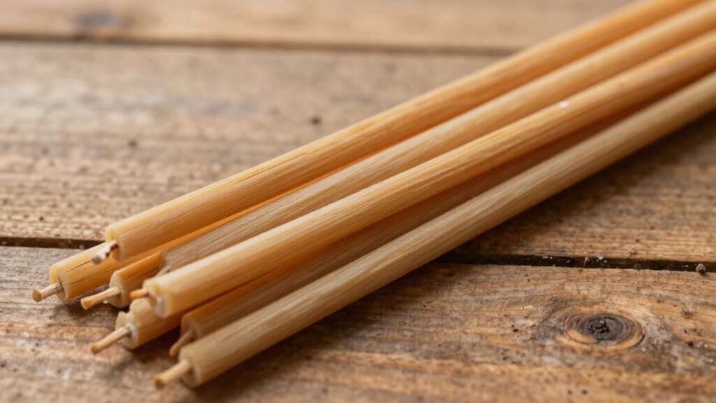 Another benefit of using wooden wick bundles is their impact on burn duration. Wooden wicks tend to burn longer and more evenly, which extends the overall life of your candle. This longer burn time isn’t just about convenience; it also ensures that your candle maintains a steady, controlled flame that reduces the risk of tunneling or uneven burning. Because wooden wicks create a larger melt pool, you’ll find that your candle lasts considerably longer, offering better value and a more satisfying burn. Plus, the even burn helps preserve the integrity of your wax, preventing excessive soot and smoke, which can sometimes occur with traditional cotton wicks. Additionally, wooden wick bundles are compatible with airless paint sprayers, making them a versatile choice for various projects. The aesthetic appeal of wooden wicks adds another layer of appeal. They give your candles a rustic, natural look that complements many decor styles, especially if you’re aiming for an eco-conscious or minimalist vibe. When you use wooden wick bundles, you also gain control over the wick size and thickness, allowing you to customize your candles for specific scent throw and burn duration needs. You might find that a thicker wick enhances scent throw even further, while a thinner one conserves wax and extends burn time. Incorporating eco-friendly materials into your candle-making process can also enhance the appeal for environmentally conscious consumers. Moreover, using sustainable materials aligns with the principles of biodiversity conservation and promotes a greener lifestyle. Additionally, selecting renewable resources for your wicks underscores a commitment to sustainable craftsmanship.